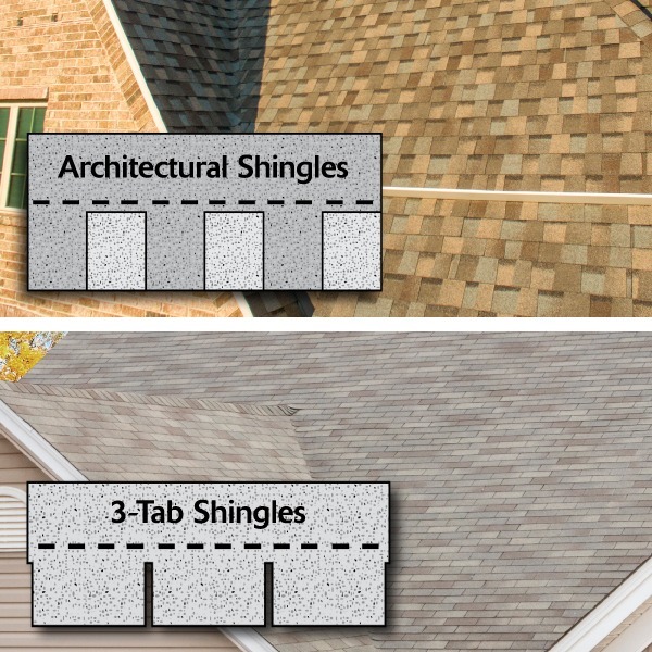 The big difference in how 3-tab and architectural shingles are designed is that 3-tab shingles lie flat, whereas architectural shingles are layered to create dimensionality.