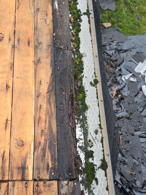- Rotting the roof: If your gutter guard gets clogged with algae, water cannot flow through it properly. Sometimes the gutter guard gets so clogged that the water soaks into the roof, causing the roof decking to rot. Here’s an example of what that looks like: