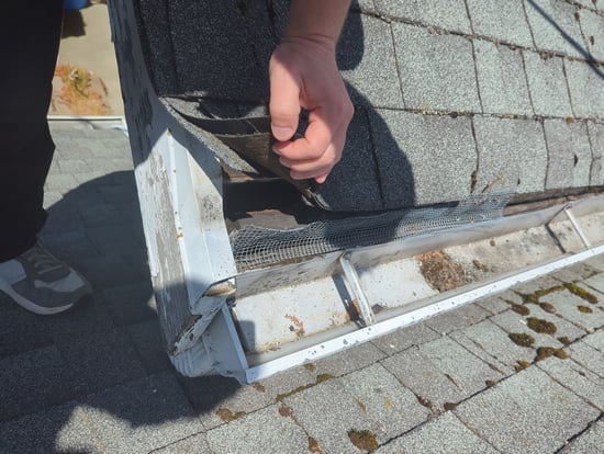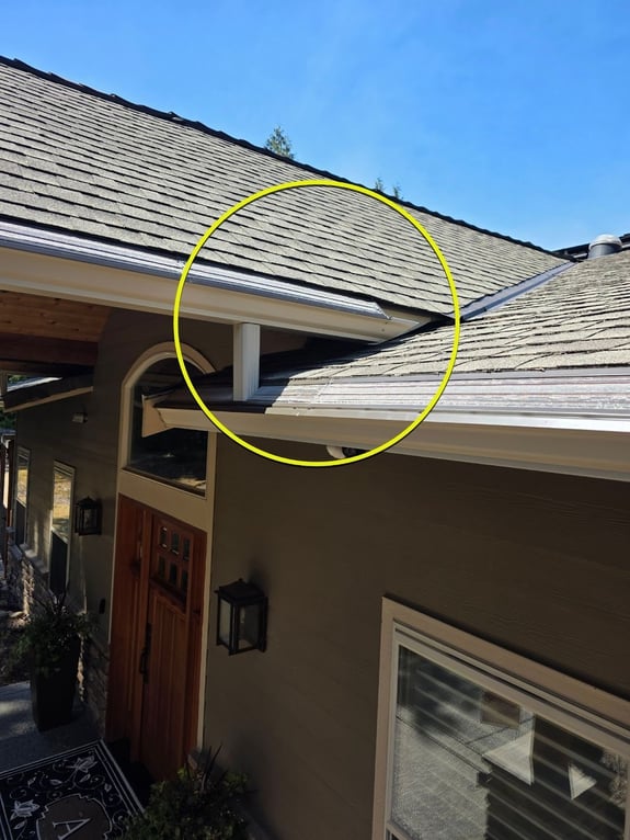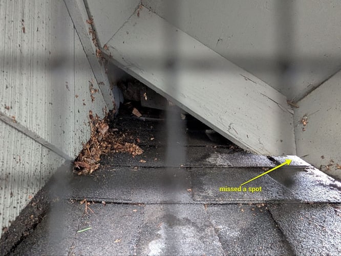 The gap looks exaggerated in this, but pests can get in if they go above the fascia board, right where it meets the asphalt shingles. It’s a giant opening if they can find it (and they will).