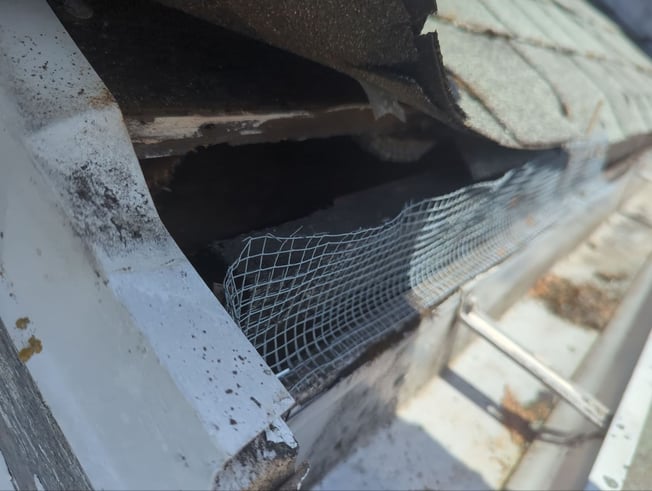Someone put up this mesh wiring to block the gap right above the gutter. However, that gap above the mesh was left wide open. The mesh should’ve been installed all the way up to the edge of the roof decking.