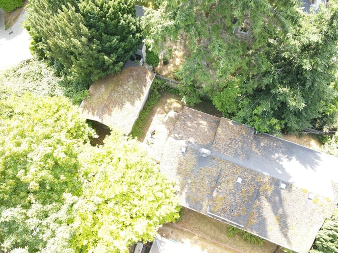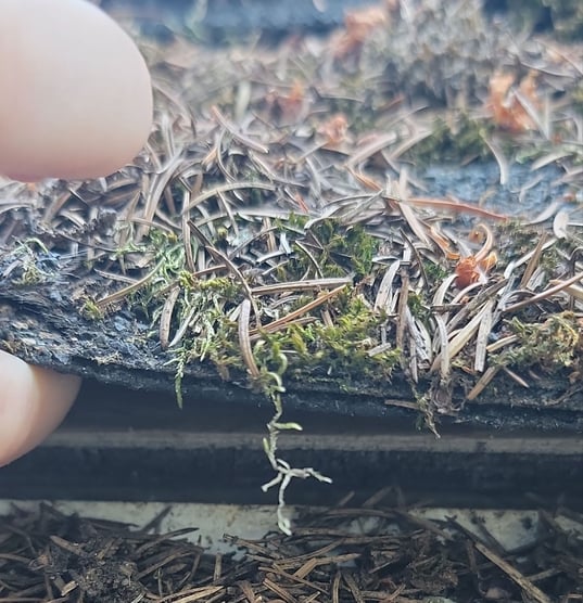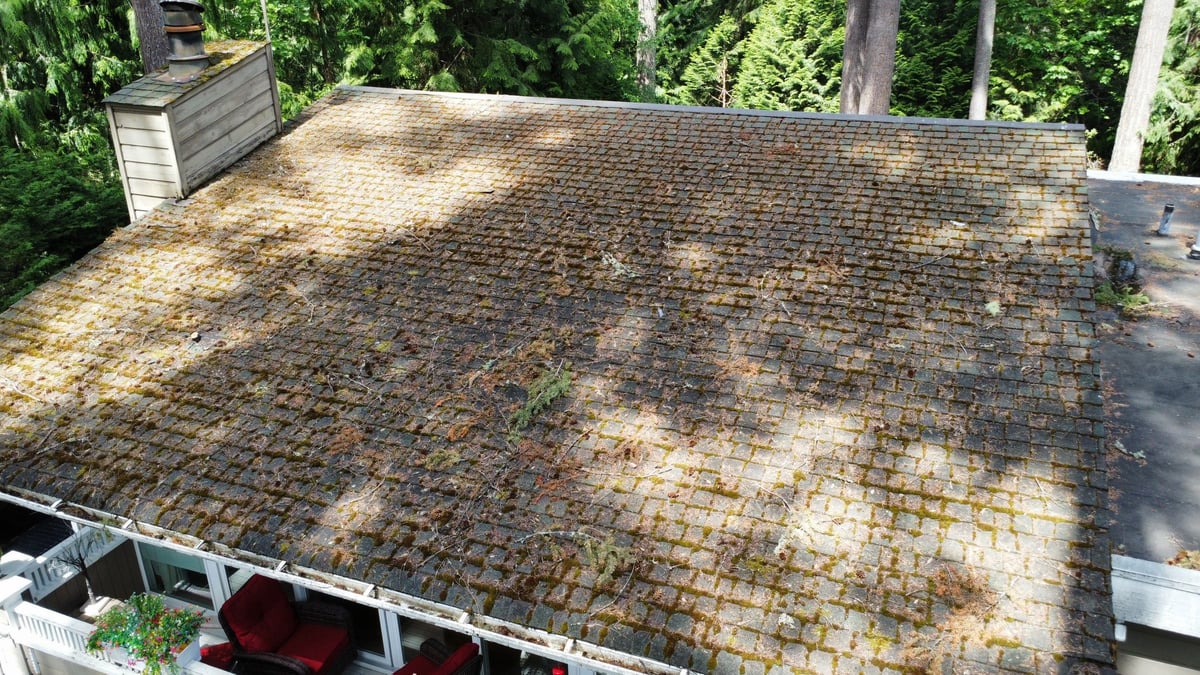 For example, here’s a roof with moss growth and a ton of debris due to all the trees surrounding it: