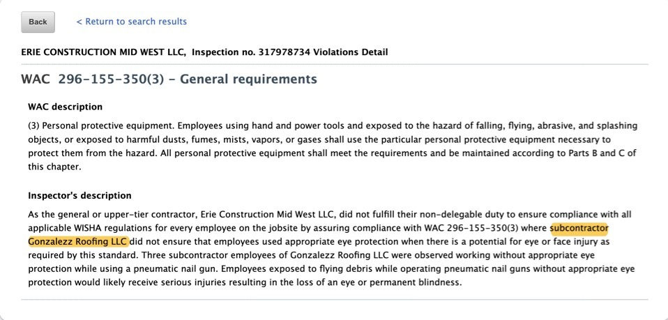 - Subcontractor Names in Violation Reports: You can also check for evidence of subcontractors by checking if they’re named in safety violation reports. For example, this company has a violation for not ensuring that their subcontractor was tied off while working on the roof: