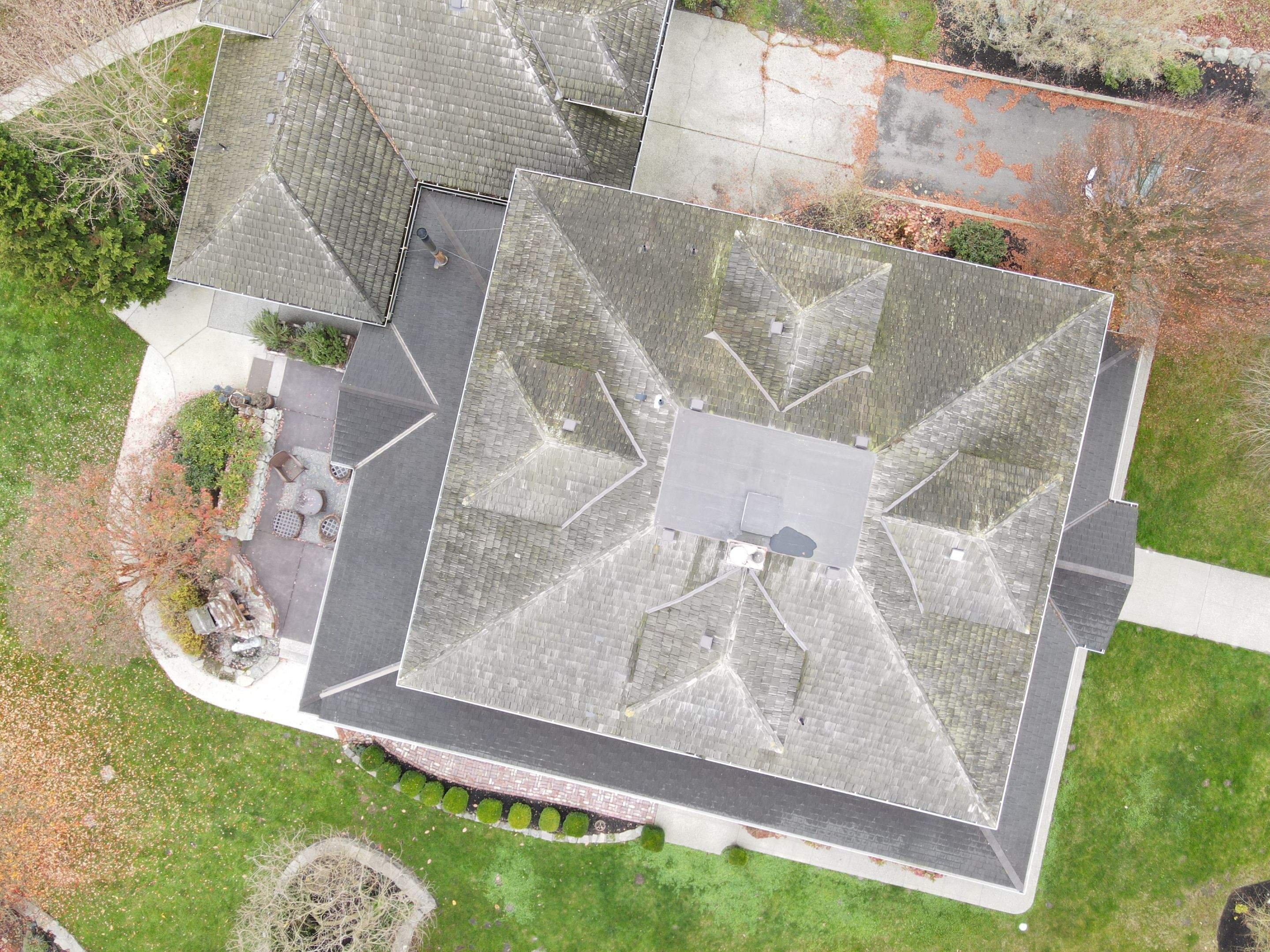 As you can see in this picture, some of the gaps line up, while others do not. These have been almost certainly replaced because they look a little bit newer than the rest of the roof, and they usually don’t last as long as the shakes used on the actual roof.