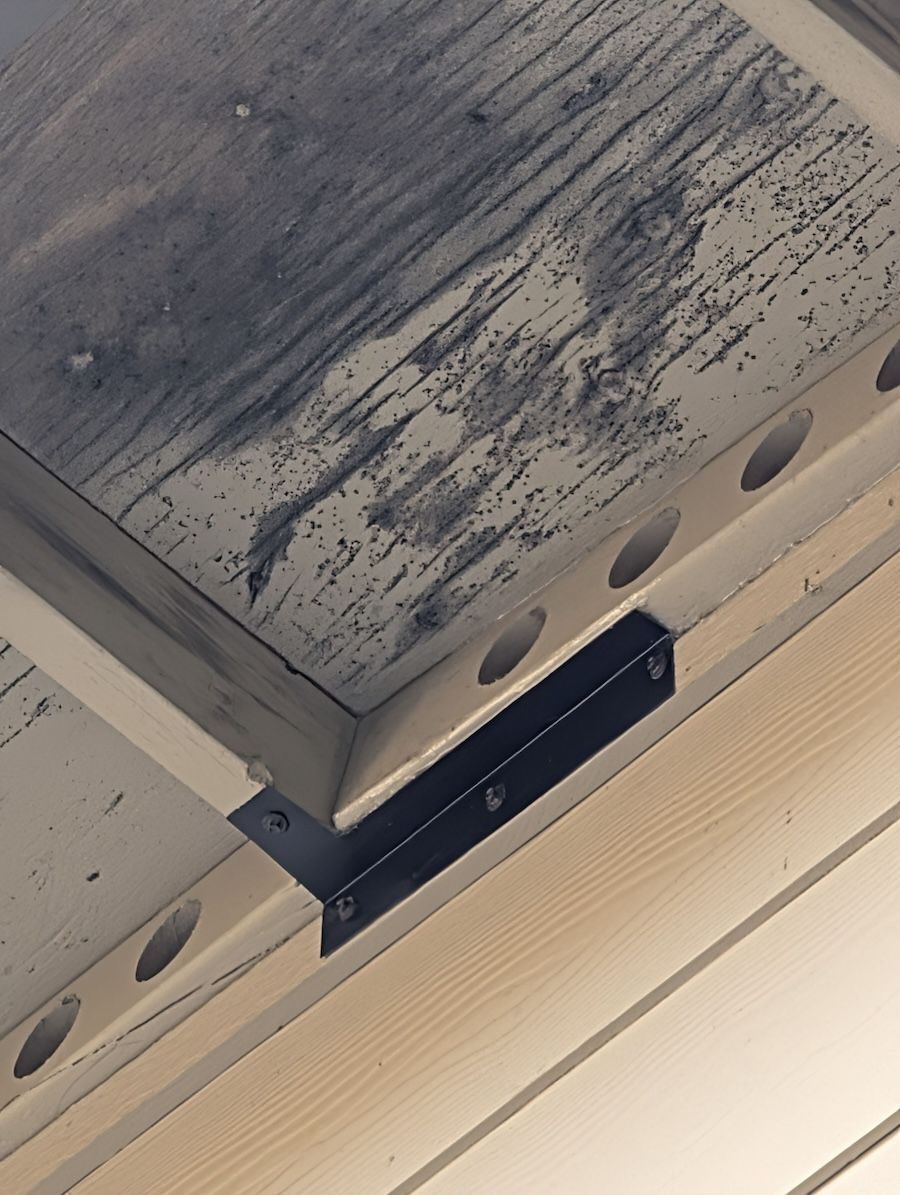 Remember what the mildew looked like on the board in the attic? This is the same board, just on the outside: