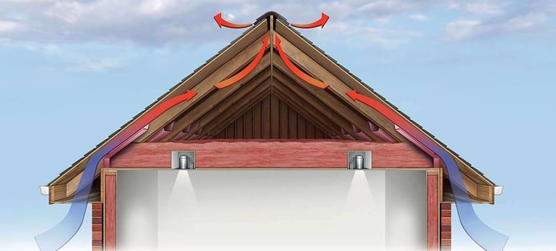 Balanced ventilation means that around half of the needed ventilation will be located in the higher portions of your attic. The remaining intake will be within the lower ⅓ of the attic space. Exhaust vents are typically located no more than 3 feet from the ridge and are commonly continuous ridge vents or evenly spaced static vents.