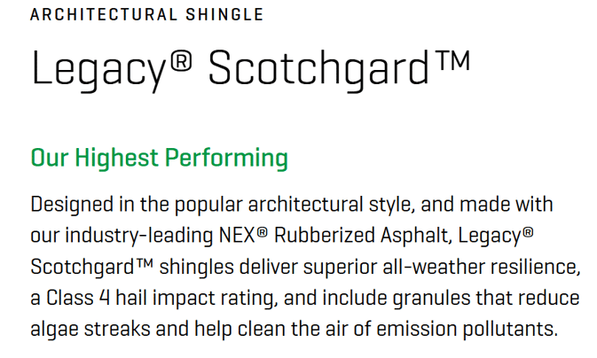 The Malarkey Legacy is a good product (with a Class 4 impact rating and algae resistance technology), and it’s been around for a long time.