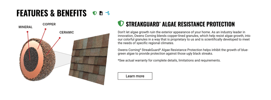 - How Does the Oakridge Prevent Algae in Rainy Seattle? Unlike other shingle brands, Owens Corning infuses the Oakridge with copper granules (this is a benefit of it technically being an architectural shingle, which all have copper granules). This means that it has built-in algae resistance technology, keeping algae from growing on your roof.