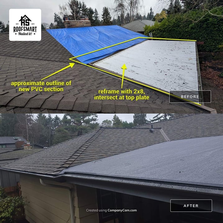 So we converted the built-in gutters, reframed and reroofed the awning, made it so that it doesn't have dead spots anymore, added insulation, and built a new storage platform in the attic above the insulation layer so he didn't lose storage area.