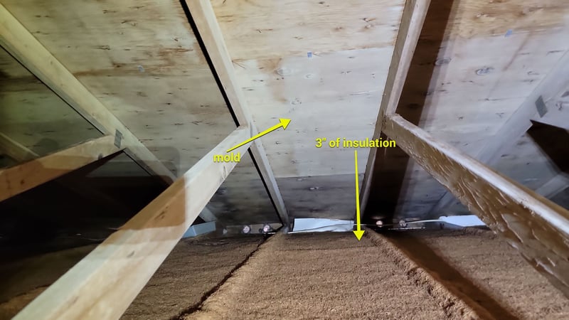But the even bigger problem is that low insulation is going to lead to condensation in the attic in the winter. You do NOT want any sort of moisture build-up in your attic, because that will almost always lead to rotting wood and mold.