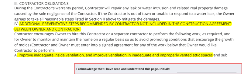 - Scope of Work: When signing the contract, you might be promising that even though you talked about mold with your roofer, they make no guarantee that they will fix it. Or, they might’ve said that they're going to do ventilation, but then the contract says that they're actually not responsible if it works or not. This is actually something that we’ve seen before in another roofer’s contract: